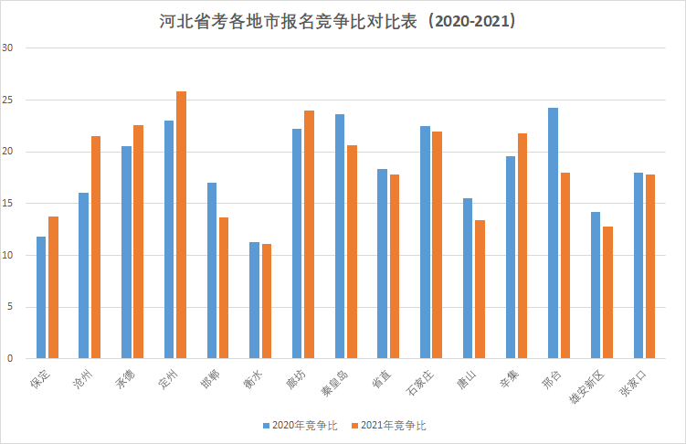 2021年各地市報名競爭比最高的是定州、廊坊;2020年各地市競爭比最高的是邢臺、秦皇島。