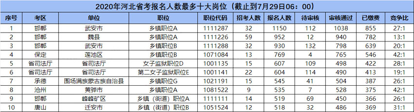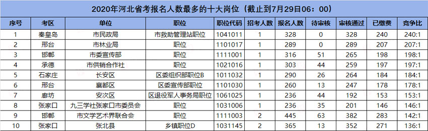2020年競爭最激烈的崗位前三分別為秦皇島市民政局救助管理站職位,競爭比240:1;邢臺市林業(yè)局職位,競爭比207:1;邯鄲市委宣傳部職位,競爭比198:1。
