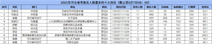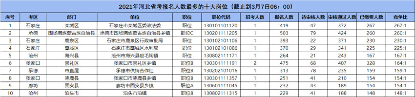 2021年競爭最激烈的崗位前三分別為石家莊市欒城區(qū)區(qū)委政法委職位,競爭比267:1;承德圍場滿族蒙古族自治縣鄉(xiāng)鎮(zhèn)職位C,競爭比260:1;石家莊鹿泉區(qū)行政審批局職位,競爭比230:1。