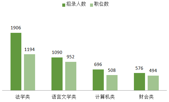 本次考試招錄中法學(xué)、語言文學(xué)類、計(jì)算機(jī)類和財(cái)會(huì)類四類專業(yè)需求量較大,其中法學(xué)類專業(yè)人氣最旺,提供1194個(gè)職位、招錄1906人,有法學(xué)類專業(yè)背景的考生選擇空間加大,要結(jié)合自身的學(xué)歷、資格證書等其他條件最終選出自己心儀的職位。