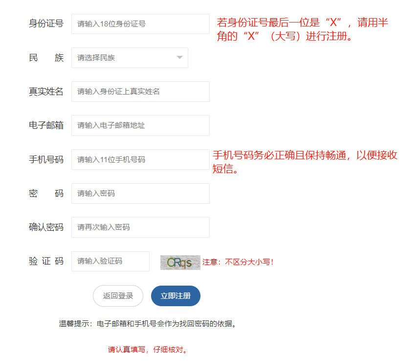 同一身份證號(hào)僅允許注冊(cè)一次,請(qǐng)勿重復(fù)注冊(cè)。應(yīng)準(zhǔn)確輸入身份證號(hào)、姓名、民族,保證注冊(cè)信息和本人身份證信息相符。用戶名(身份證號(hào))和密碼要妥善保管,如密碼丟失,可使用系統(tǒng)提供方式找回密碼。用戶名(身份證號(hào))和密碼如被他人盜用責(zé)任自負(fù)。