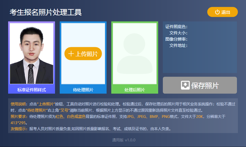 照片要求:待處理照片須為紅色、白色或藍(lán)色背景的標(biāo)準(zhǔn)證件照,支持JPG、JPEG、BMP、PNG格式,文件大于20K,分辨率大于413*295。