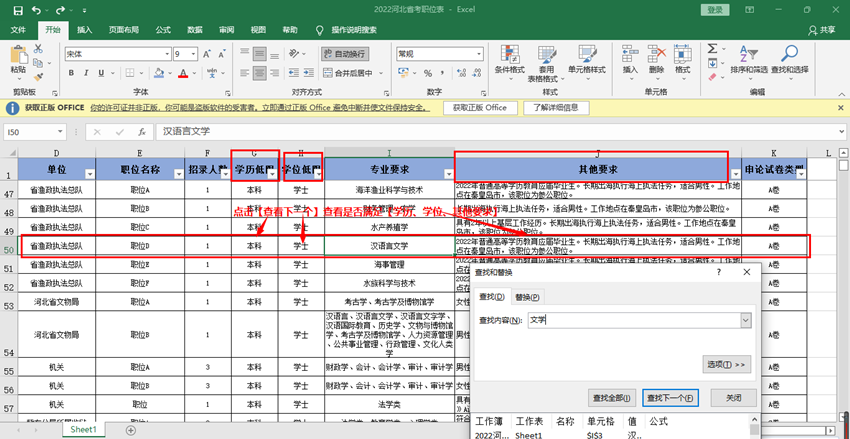 考生在篩選完基本條件后,還應(yīng)尤為注意備注欄中的信息,備注欄中的信息才是該崗位真正的特殊限制條件,所以篩選條件時(shí)候一定要謹(jǐn)慎,不要漏掉備注信息,綜合基本條件和備注條件后選出最適合自身的崗位。