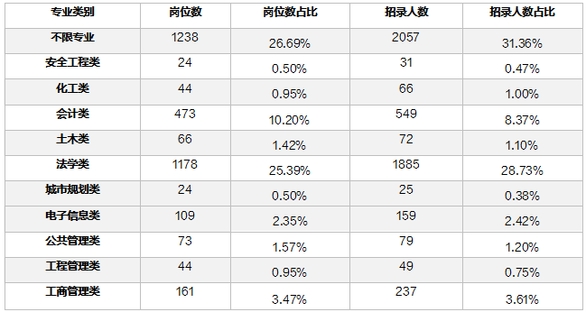 從今年的招錄情況來看,限制專業(yè)職位當(dāng)中,法學(xué)類占比較大,可選擇范圍最廣。還有會(huì)計(jì)類、工商管理類、電子信息類等專業(yè)也比較熱門。