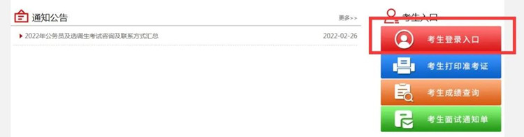 進入河北省2022年度公務員錄用省市縣鄉(xiāng)四級聯(lián)考暨選拔選調生考試專題后點擊右側的考生登錄入口。