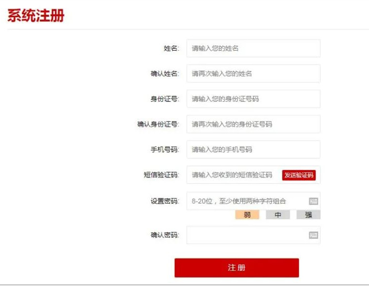 依次填寫各項信息,注意檢查好姓名、身份證號和手機號是否正確,記住登錄密碼再點擊注冊按鈕完成注冊。