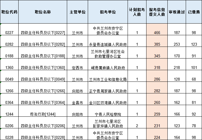 截止2月28日17時,2022年甘肅公務(wù)員考試共有26501人提交報名,15081人通過審核,8392人繳費(fèi),168個崗位無人報考,具體數(shù)據(jù)詳見附件: