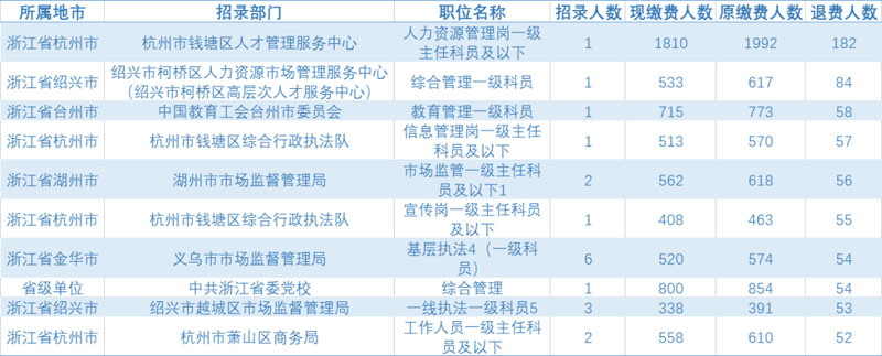2022浙江省考退費(fèi)人數(shù)最多的前十崗位