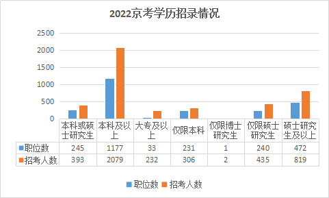 2022北京公務(wù)員考試提供的職位中,學(xué)歷要求劃分明細(xì),大專(zhuān)可報(bào)職位共有33個(gè),占總職位數(shù)的1.38%,招錄232人,占總招錄人數(shù)的5.44%;本科可報(bào)職位共有1686個(gè),占總職位數(shù)的70.28%;碩士研究生可報(bào)職位共有2167個(gè),占總職位數(shù)的90.33%;博士研究生可報(bào)職位共有1683個(gè),占總職位數(shù)的70.15%;