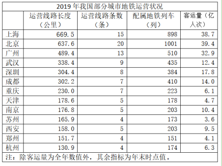 119.表中所列2019年地鐵客運量超過10億人次的城市中,2019年平均每條地鐵運營線路長度超過40公里的城市有幾個?( )