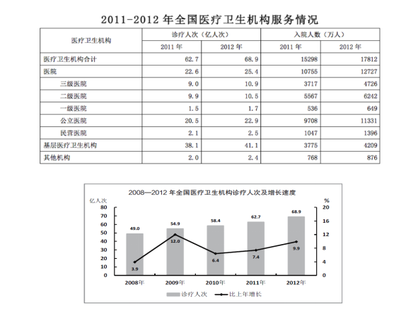 (1)2010-2012年三年,全國醫(yī)療衛(wèi)生機(jī)構(gòu)年平均診療人次為63.3萬;