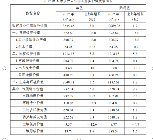 B、2017年A市現(xiàn)代農(nóng)業(yè)生態(tài)服務(wù)價值年值增長率、貼現(xiàn)值增長率最低的是同一個指標(biāo)