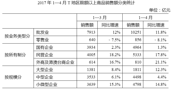 2017年1—4月,T地區(qū)批發(fā)和零售業(yè)商品銷售總額為15220億元,同比增長10.5%,其中,限額以上商品銷售額達到11107億元,同比增長10%;4月份,T地區(qū)批發(fā)和零售業(yè)商品銷售總額和限額以上商品銷售額分別為3339億元和2554億元。