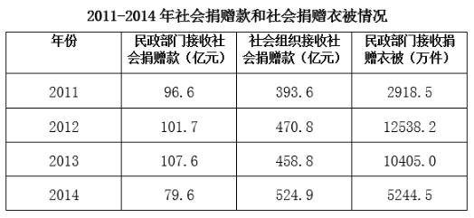 A、2011~2015年民政部門(mén)接收的社會(huì)捐贈(zèng)款在持續(xù)增加