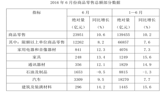 2016年1~6月份,我國(guó)社會(huì)消費(fèi)品零售總額156138億元,同比增長(zhǎng)10.3%。其中,限額以上單位消費(fèi)品零售額71075億元,同比增長(zhǎng)7.5%。