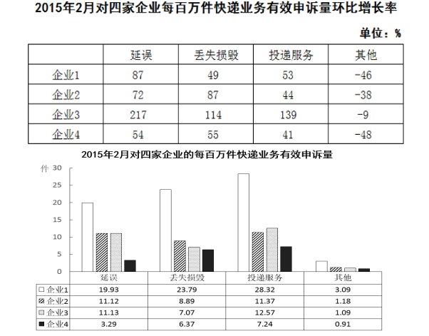 D、2015年2月,企業(yè)1的每百萬快遞業(yè)務(wù)延誤有效申訴量超過任何企業(yè)的2倍