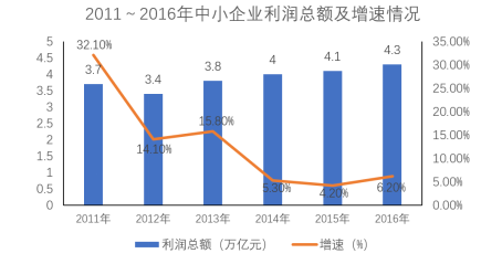 2016年,中小企業(yè)實現(xiàn)利潤總額4.3萬億元,同比增長6.2%,增速比上年提高2.0個百分點,其中,中型企業(yè)利潤總額1.8萬億元,同比增長6.4%,小型企業(yè)利潤總額2.5萬億元,同比增長6.1%。