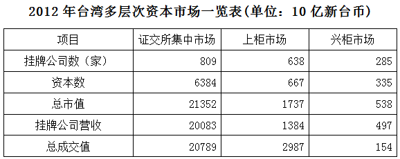 臺灣資本市場第三層次為興柜市場。在準入門檻方面,興柜市場沒有營業(yè)利潤、資本額、設(shè)立年限的限制,只須符合已經(jīng)申報上市或上柜輔導(dǎo)且兩家以上證券商書面推薦。至2012年底,興柜公司285家,資本額0.335兆新臺幣,總市值0.538兆新臺幣。
