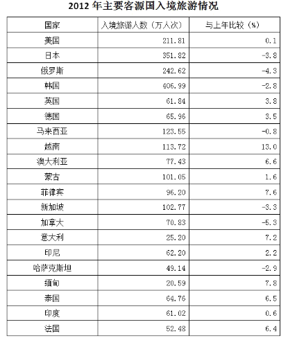 2012年,全國國內(nèi)旅游人數(shù)29.57億人次,比上年增長12.0%。其中,城鎮(zhèn)居民19.33億人次。2012年,全國國內(nèi)旅游收入22706.22億元人民幣,比上年增長17.6%。2012年全年入境外國游客人數(shù)比上年增長0.3%,其中,亞洲市場入境人數(shù)1664.88萬人次,與上年基本持平,占入境外國游客人數(shù)的61.2%;歐洲市場入境人數(shù)592.16萬人次,增長0.2%;美洲市場入境人數(shù)317.95萬人次,減少0.7%;大洋洲市場入境人數(shù)91.49萬人次,增長6.5%;非洲市場入境人數(shù)52.49萬人次,增長7.4%。