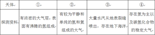 13.“旅行者1號”空間探測器經(jīng)過36年的人類星際探索,沿途探索①木星②土星③土衛(wèi)二④土衛(wèi)六是否存在生命跡象,并發(fā)回資料。閱讀表格,依據(jù)探測資料判斷將來最有可能孕育生命的天體是( )