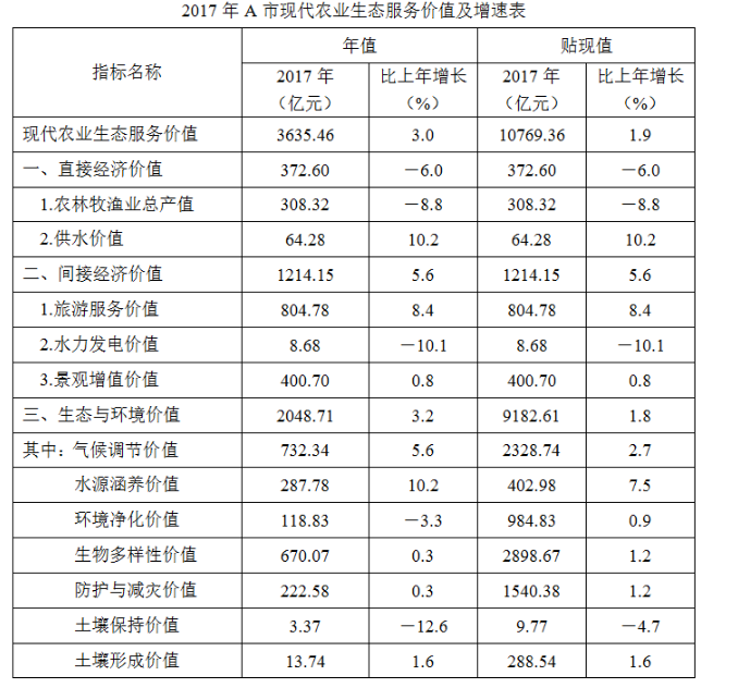 B、2017年A市現(xiàn)代農(nóng)業(yè)生態(tài)服務(wù)價值年值增長率、貼現(xiàn)值增長率最低的是同一個指標
