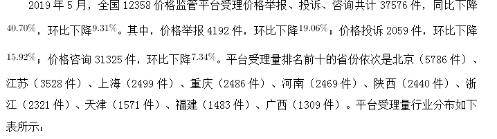 B、2019年5月,平臺受理價格咨詢數(shù)量環(huán)比下降幅度最大