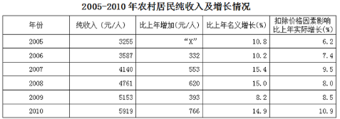 “十一五”期間,我國農(nóng)村居民人均純收入由2005年的3255元提高到2010年的5919元,增加2664元,年均增長12.7%;扣除價格因素后,實際年均增長8.9%。比“十五”期間農(nóng)村居民收入年均實際增長速度高3.6個百分點。