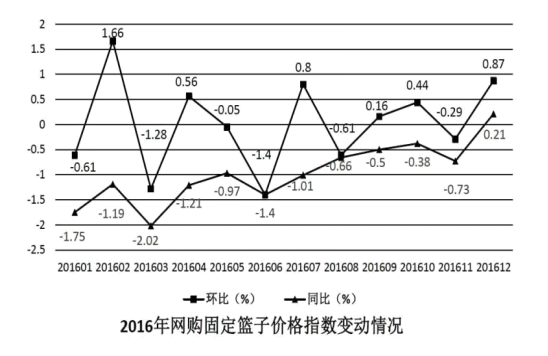 A、2016年,網(wǎng)購(gòu)固定籃子價(jià)格指數(shù)曾連續(xù)3個(gè)月環(huán)比負(fù)增長(zhǎng)