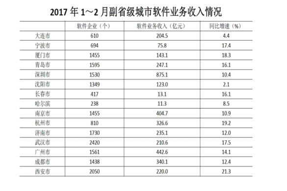 A、軟件業(yè)務(wù)收入增速最快的副省級(jí)城市,軟件企業(yè)數(shù)量排名第三