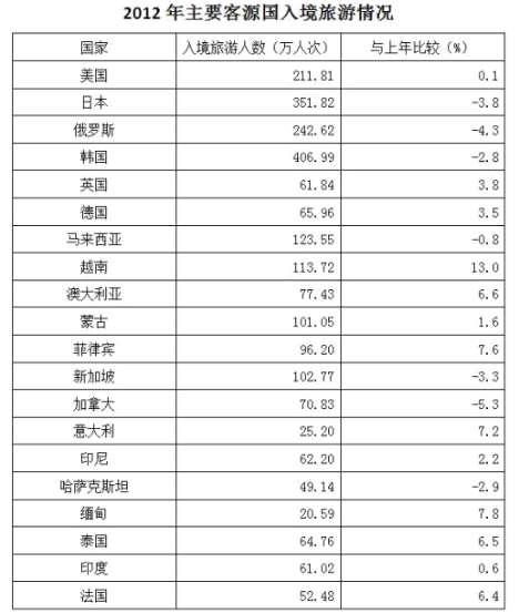 A、2012年,韓國(guó)為我國(guó)第一大入境客源國(guó)
