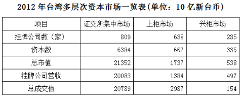 臺(tái)灣資本市場(chǎng)第三層次為興柜市場(chǎng)。在準(zhǔn)入門(mén)檻方面,興柜市場(chǎng)沒(méi)有營(yíng)業(yè)利潤(rùn)、資本額、設(shè)立年限的限制,只須符合已經(jīng)申報(bào)上市或上柜輔導(dǎo)且兩家以上證券商書(shū)面推薦。至2012年底,興柜公司285家,資本額0.335兆新臺(tái)幣,總市值0.538兆新臺(tái)幣。