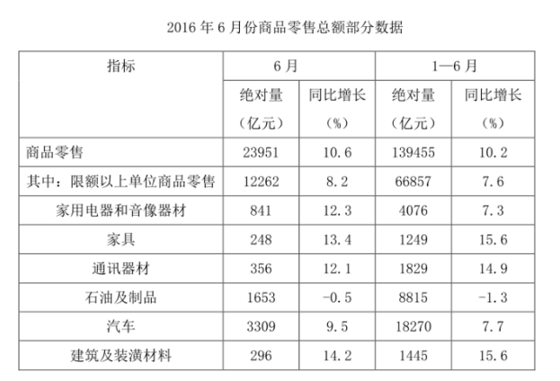 按經(jīng)營單位所在地分,2016年6月份,城鎮(zhèn)消費(fèi)品零售額23082億元,同比增長10.5%;鄉(xiāng)村消費(fèi)品零售額3775億元,同比增長11.2%。1-6月份,城鎮(zhèn)消費(fèi)品零售額134249億元,同比增長10.2%;鄉(xiāng)村消費(fèi)品零售額21889億元,同比增長11.0%。