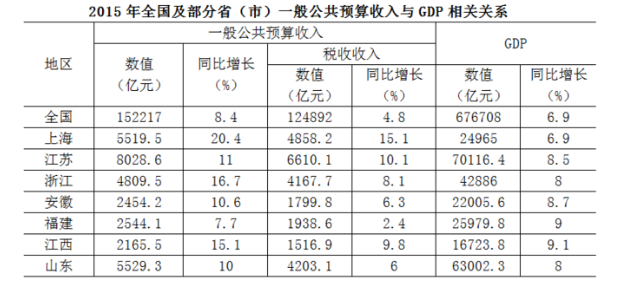 B、2015年江蘇一般公共預(yù)算收入、稅收收入、GDP均最高