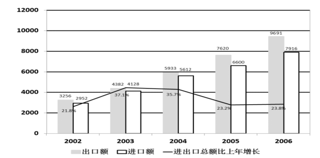B、2003—2006年,我國進出口總額呈上漲狀態(tài)