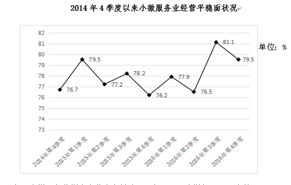 2016年,該省小微服務(wù)業(yè)樣本企業(yè)實現(xiàn)營業(yè)收入80.1億元,同比增長15.4%,高于規(guī)模以上重點服務(wù)業(yè)企業(yè)8.2個百分點,增速比上年回落0.6個百分點。經(jīng)營平穩(wěn)面擴大,2016年4季度,79.5%的企業(yè)認(rèn)為本企業(yè)綜合經(jīng)營狀況良好或穩(wěn)定,同比提高3.3個百分點,處于歷史較高水平。