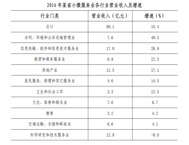 2016年,某省小微服務(wù)業(yè)呈現(xiàn)出經(jīng)營平穩(wěn)面、資產(chǎn)規(guī)模、享受稅收優(yōu)惠政策范圍“三擴大”的特點,主要行業(yè)實現(xiàn)較快增長。