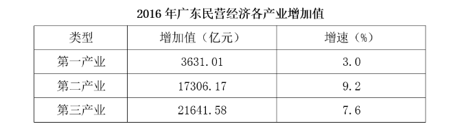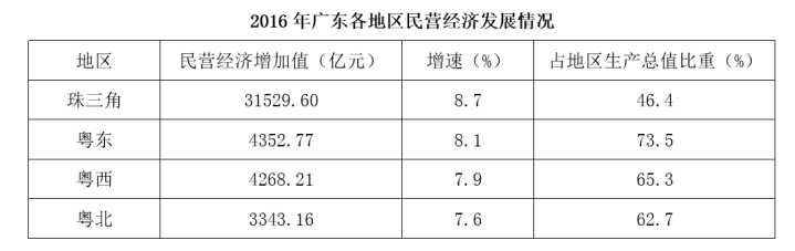 2016年,廣東民營經(jīng)濟增加值突破四萬億元。經(jīng)初步核算,全年實現(xiàn)民營經(jīng)濟增加值42578.76億元,按可比價計算,比上年同期增長7.8%,增幅高于同期GDP增幅0.3個百分點,其中第二產(chǎn)業(yè)增幅比同期GDP第二產(chǎn)業(yè)增幅高3個百分點。民營經(jīng)濟占GDP的比重為53.6%,比2010年提高3.9個百分點,占比逐年提高;對GDP增長的貢獻(xiàn)率為55.5%,同比提高1.3個百分點,拉動GDP增速達(dá)4.2個百分點,民營經(jīng)濟的作用不斷提升,是廣東經(jīng)濟增長的主力軍。