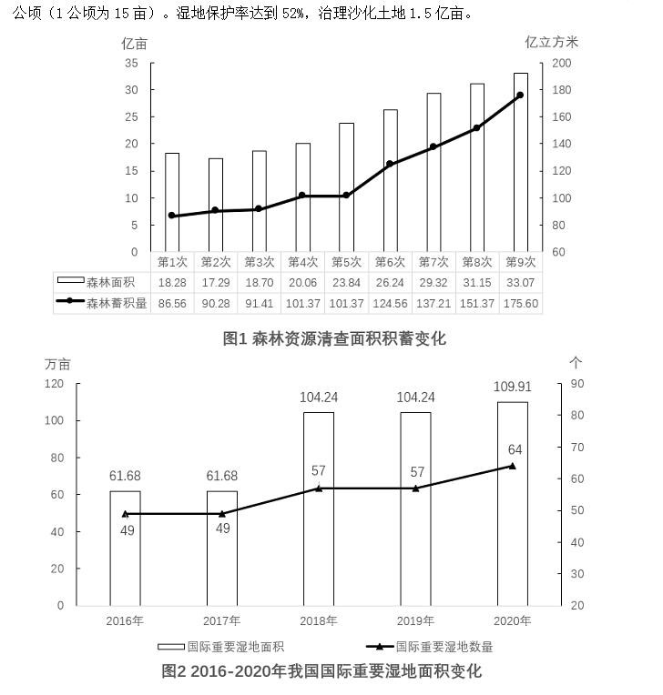 增加森林面積、提高森林質量、提升生態(tài)系統(tǒng)碳匯增量,將為我國實現(xiàn)碳達峰、碳中和目標、維護全球生態(tài)安全做出巨大貢獻。1973年,我國開展了第一次森林資源清查。目前已完成第9次森林資源清查,我國森林面積和森林蓄積量連續(xù)30年保持“雙增長”?!笆濉睍r期,我國累計造林5.45億畝,森林覆蓋率達到23.04%,森林蓄積量為175.6億立方米,森林面積達到2.2億公頃(1公頃為15畝)。濕地保護率達到52%,治理沙化土地1.5億畝。