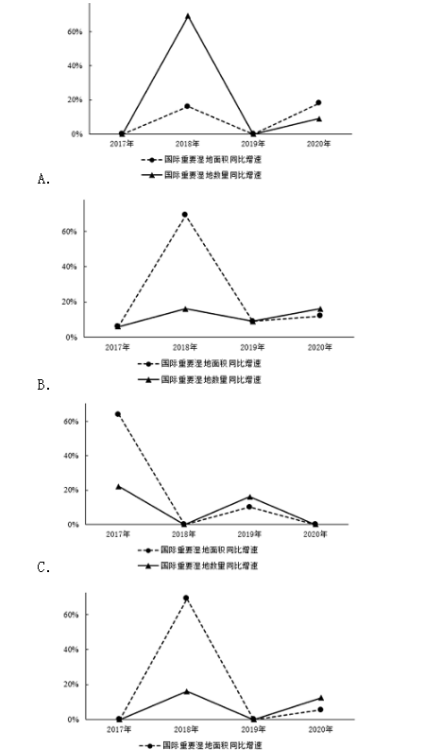 94.以下選項中,最準確地反映了2017-2020年我國國際重要濕地面積、數(shù)量同步增速變化情況的是:( )