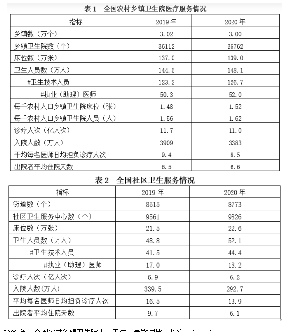 C.2019-2020年,全國鄉(xiāng)鎮(zhèn)衛(wèi)生院年平均入院人數(shù)是全國社區(qū)服務中心的十倍以上
