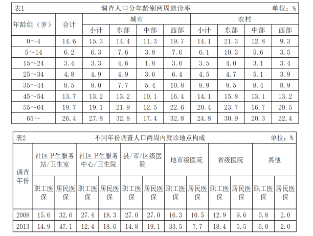 兩周就診率被定義為每百人中兩周內(nèi)因病或身體不適尋求各級醫(yī)療機(jī)構(gòu)治療服務(wù)的人次數(shù)。第五次國家衛(wèi)生服務(wù)調(diào)查結(jié)果顯示,調(diào)查地區(qū)居民兩周就診率為13.0%,其中城市地區(qū)為13.3%,農(nóng)村地區(qū)為12.8%。城市地區(qū),東部、中部、西部兩周就診率分別為15.4%、8.8%、15.8%;農(nóng)村地區(qū),東部、中部、西部兩周就診率分別為16.1%、11.4%、11.0%。
