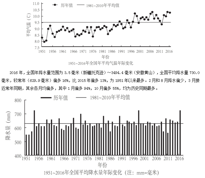 2016年,全國平均氣溫10.36℃,較常年平均氣溫偏高0.81℃,為1951年以來第三高,僅次于2015年(10.49℃)和2007年(10.45℃)。2016年四季氣溫均偏高,其中夏季氣溫為歷史最高;除1月偏低、11月接近常年同期外,其余各月均偏高,其中12月偏高2.6℃,為歷史同期最高。全國31個(gè)?。▍^(qū)、市)中,僅黑龍江平均氣溫較常年偏低0.2℃,其他?。▍^(qū)、市)氣溫均偏高,其中青海、甘肅、河南和貴州4省均為1951年以來的歷史最高。