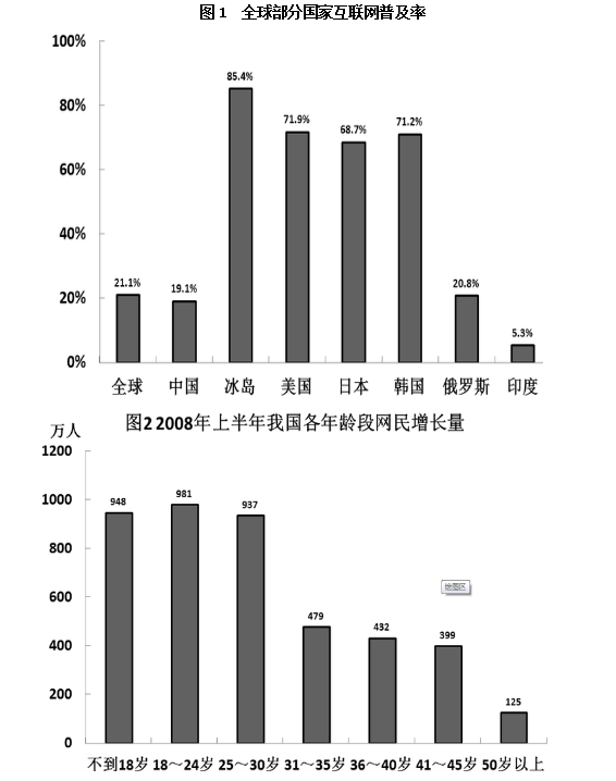 CNNIC于2008年7月發(fā)布的《第22次中國互聯(lián)網(wǎng)絡(luò)發(fā)展?fàn)顩r統(tǒng)計報告》顯示,我國網(wǎng)民數(shù)達(dá)2.53億,超過美國居世界首位。盡管如此,我國互聯(lián)網(wǎng)普及率只有19.1%,仍然低于21.1%的全球平均水平。與上年同期相比,我國網(wǎng)民人數(shù)增加了9100萬,是歷年來增長最快的一年,同比增長56.2%。僅2008年上半年,我國網(wǎng)民數(shù)凈增量就達(dá)4300萬。統(tǒng)計表明,我國網(wǎng)站數(shù)量持續(xù)增長,截至2008年7月共有網(wǎng)站191.9萬個,同比增長率為46.39%;其中CN域名下的網(wǎng)站數(shù)為136.9萬個。