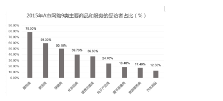 A市統(tǒng)計(jì)局在該市范圍內(nèi)做了一項(xiàng)調(diào)查,抽取了5000名18到70周歲且在2015年有過(guò)網(wǎng)購(gòu)經(jīng)歷的居民,結(jié)果顯示:受訪者2015年人均網(wǎng)購(gòu)次數(shù)為19.4次。從分組情況看,有三類(lèi)人群使用網(wǎng)購(gòu)相對(duì)頻繁:一是年輕群體,35歲以下的受訪者人均網(wǎng)購(gòu)次數(shù)為25.5次;二是較高學(xué)歷群體,文化程度為大學(xué)本科及以上學(xué)歷和大專(zhuān)學(xué)歷的受訪者人均網(wǎng)購(gòu)次數(shù)分別是27.3次和21.8次;三是中高收入群體,個(gè)人月收入為10000元以上和5000到10000元的受訪者人均網(wǎng)購(gòu)次數(shù)分別是31.0次和26.0次。此外,女性受訪者人均網(wǎng)購(gòu)次數(shù)為21.1次,比男性受訪者高出3.8次。2015年該市網(wǎng)購(gòu)9類(lèi)主要商品和服務(wù)的受訪者占比情況如下圖。