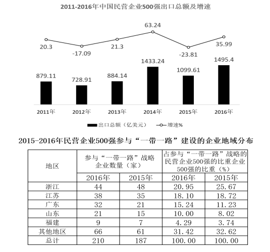 2017年8月24日,全國工商聯(lián)發(fā)布《2017中國民營企業(yè)500強(qiáng)》榜單。2016年,民營企業(yè)500強(qiáng)出口總額出現(xiàn)大幅回升,達(dá)到1495.4億美元,占我國出口總額的7.17%,較2015年增加395.79億美元,增幅為35.99%,海外投資項(xiàng)目達(dá)到1659項(xiàng),增長24.92%;投資總額達(dá)515.32億美元;進(jìn)行海外投資的企業(yè)數(shù)量也比2015年的201家增加了113家。
