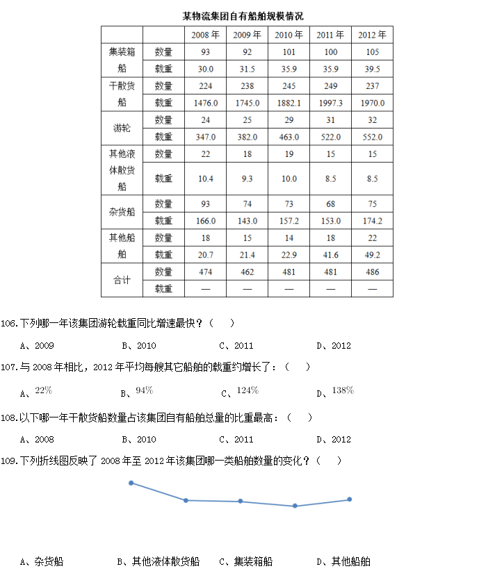 110.以下關(guān)于2008年至2012年間該集團自有船舶規(guī)模的說法正確的是:( )