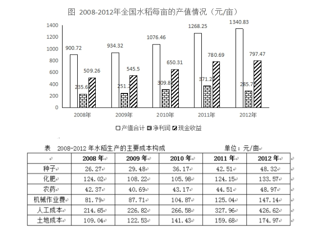 2013年全國水稻種植面積達(dá)4.55億畝,比上年增加260多萬畝。但由于強降雨及洪澇災(zāi)害,總產(chǎn)量較上年減少62萬噸,總產(chǎn)量為20361萬噸。下圖反映的是2008年至2012年我國水稻每畝的產(chǎn)值情況及水稻生產(chǎn)的主要成本構(gòu)成情況。