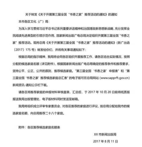 A.XX市新聞出版局關(guān)于開展第三屆全國(guó)“書香之家”推薦活動(dòng)的通知