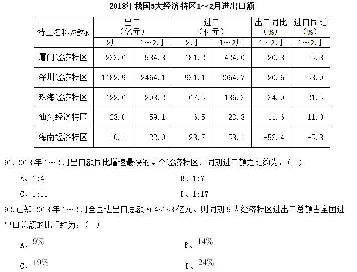 94.2018年2月,表中進(jìn)口額環(huán)比下降速度最快的經(jīng)濟(jì)特區(qū)是:( )