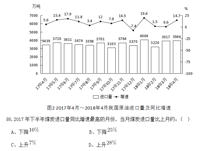 86.2017年下半年煤炭進(jìn)口量同比增速最高的月份,當(dāng)月煤炭進(jìn)口量比上月約:( )